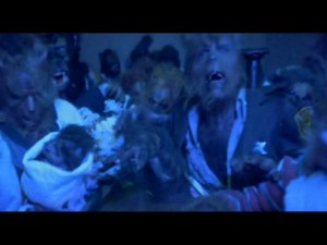 Após a caçada fracassada temos ainda mais corpos a serem enterrados e tudo fica ainda pior. Este é o ponto em que a trama vai entrar em seu embate principal: Marty Coslaw vs. O Lobisomem! Uma cena na igreja serve como a soleira desta porta (transição para um novo capítulo). Esta cena me fez lembrar do trabalho de Rick Baker em “O Lobisomem Americano em Londres” (filme anterior à este e o qual recomendo).