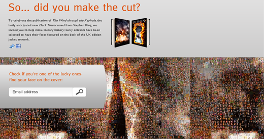 Falamos anteriormente aqui sobre a promoção em comemoração ao lançamento do novo livro da Torre Negra, “The Wind through the Keyhole” que a editora de King no Reino Unido fez para colocar fotos dos leitores na ilustração da contra-capa em um imenso mosaico. Agora o resultado saiu e você já pode conferir se foi um dos sortudos que foi parar lá pelo link: http://www.stephenkingfaces.com. Basta inserir o email que você usou para participar da promoção e clicar no campo de pesquisa. Caso sua foto tenha sido uma das selecionadas ela aparecerá em destaque para que você possa visualizá-la melhor.